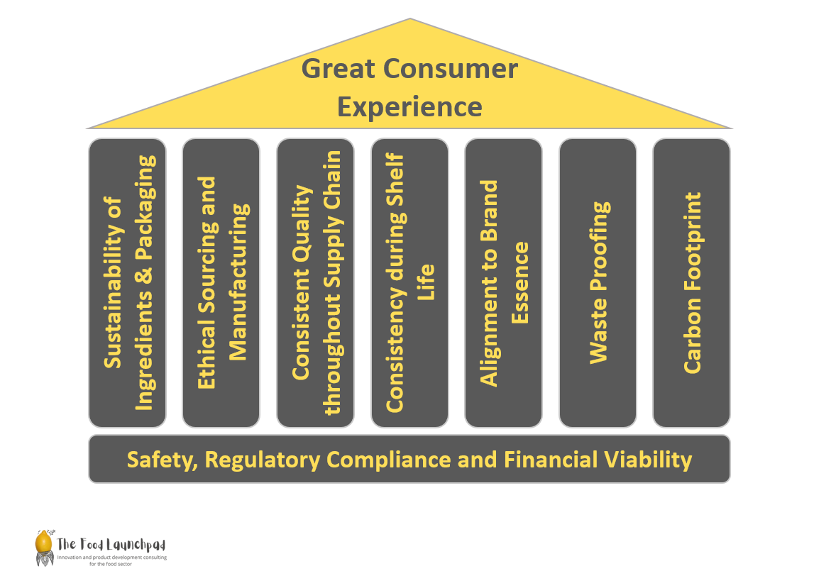 The absolute foundation is of course food safety, legality and financial viability, for the last one I have assumed that you are developing for a food business and therefore if there is no profit, the product is not sustainable. Not much else to add here, other than that by safety you need to think microbes, toxins, contamination, allergies, foreign matter, product use etc. and by legal, think export markets, special dietary groups etc.