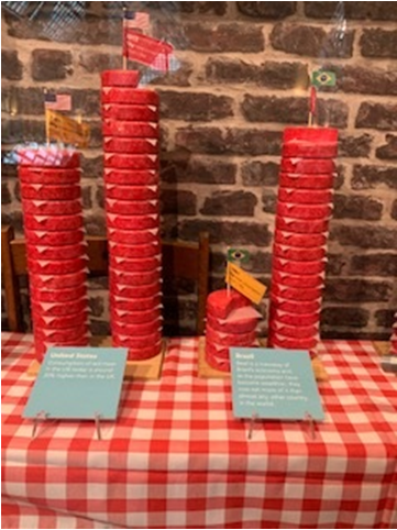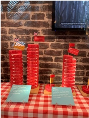 The second window showed a café front, with tables complete with red gingham tablecloths and plates of ‘burgers.’ Stacks of burgers were used to show how meat consumption had changed in the US, Brazil, UK, China and India between 1961 and 2013. It was a very good, visually impactful way of showing how meat consumption is linked to prosperity growth.